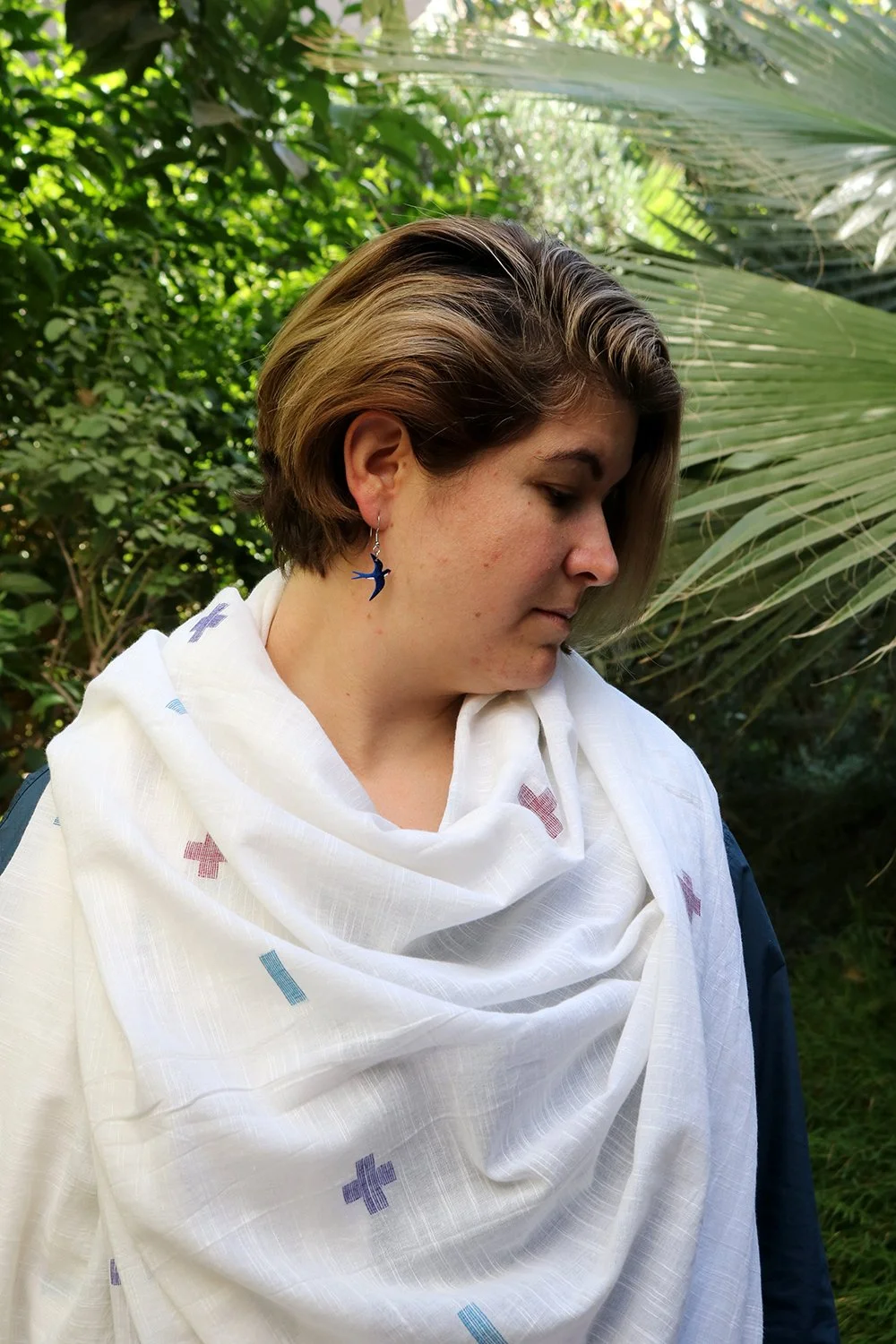 Ultralight hand loomed cotton khadi shawl with woven inlays and matching Rabati embroidery